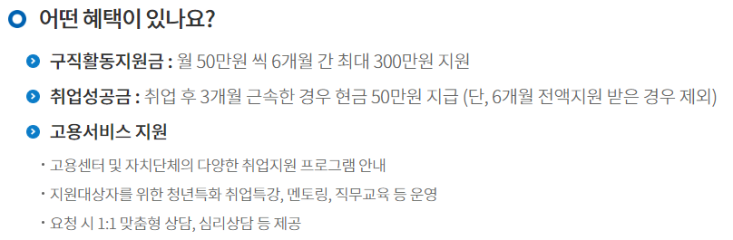 그래서 나라에서 이런 청년들의 특성을 고려해 자기주도적으로 취업활동을 하는 청년(만18세 ~34세) 에게 취업준비 비용을 지원하는 제도예요. 월 50만 원씩 최대 6개월까지 지원합니다.